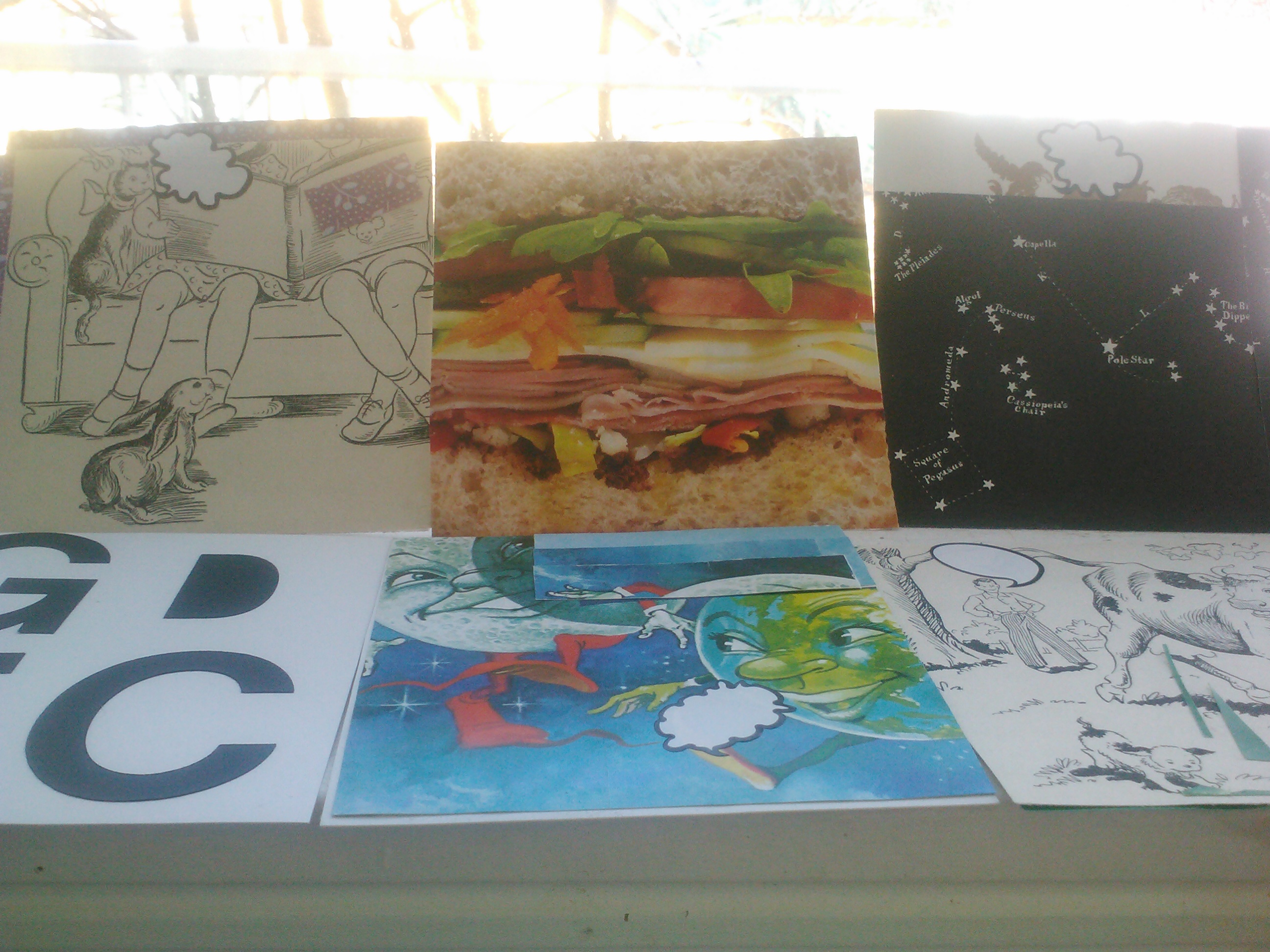 So, you may or may not know of my musical career as Big Mama Lele. I have been up late, gluey fingers and tiny bits of paper everywhere, making custom CD artwork. The album is called GDFC, because that is chord progression for all of the songs. Each of these unique collages is called something different, beginning with the letters GDFC, to celebrate all you can do and say with only 4 chords.
